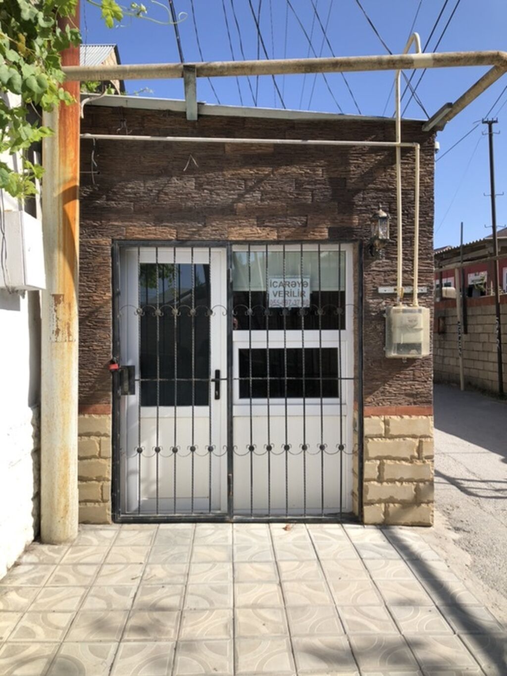 Satilir – küçəyə çıxışı olan kiçik obyekt - Fasad: dekorativ daş üzlüklü, metal barmaqlıqlı ikitərəfli şüşə qapı, fasadda işıqlandırma. - Sahə: kompakt zal, ayrıca balaca otağa/ankara keçidli (daxili qapı ilə). - Döşəmə: mərmər naxışlı kafel. - Divarlar: kərpic teksturalı dekorativ üzlük. - Tavan: işıqlı asma tavan, LED işıqlar. - Kommunikasiya: elektrik xətti çəkilib, sayğac görünür; qaz xətti və sayğac fasadda; su xətti və sayğac kənarda; içəridə su/kanalizasiya çıxarışları mövcuddur. - Təhlükəsizlik: girişdə dəmir barmaqlıq, daxildə müşahidə kamerası. - Pəncərələr: küçəyə baxan pəncərə və yan divarda vent/pəncərə. - Uyğunluq: kiçik ofis, servis, atelye, anbar, atelye-tipli fəaliyyətlər, ...