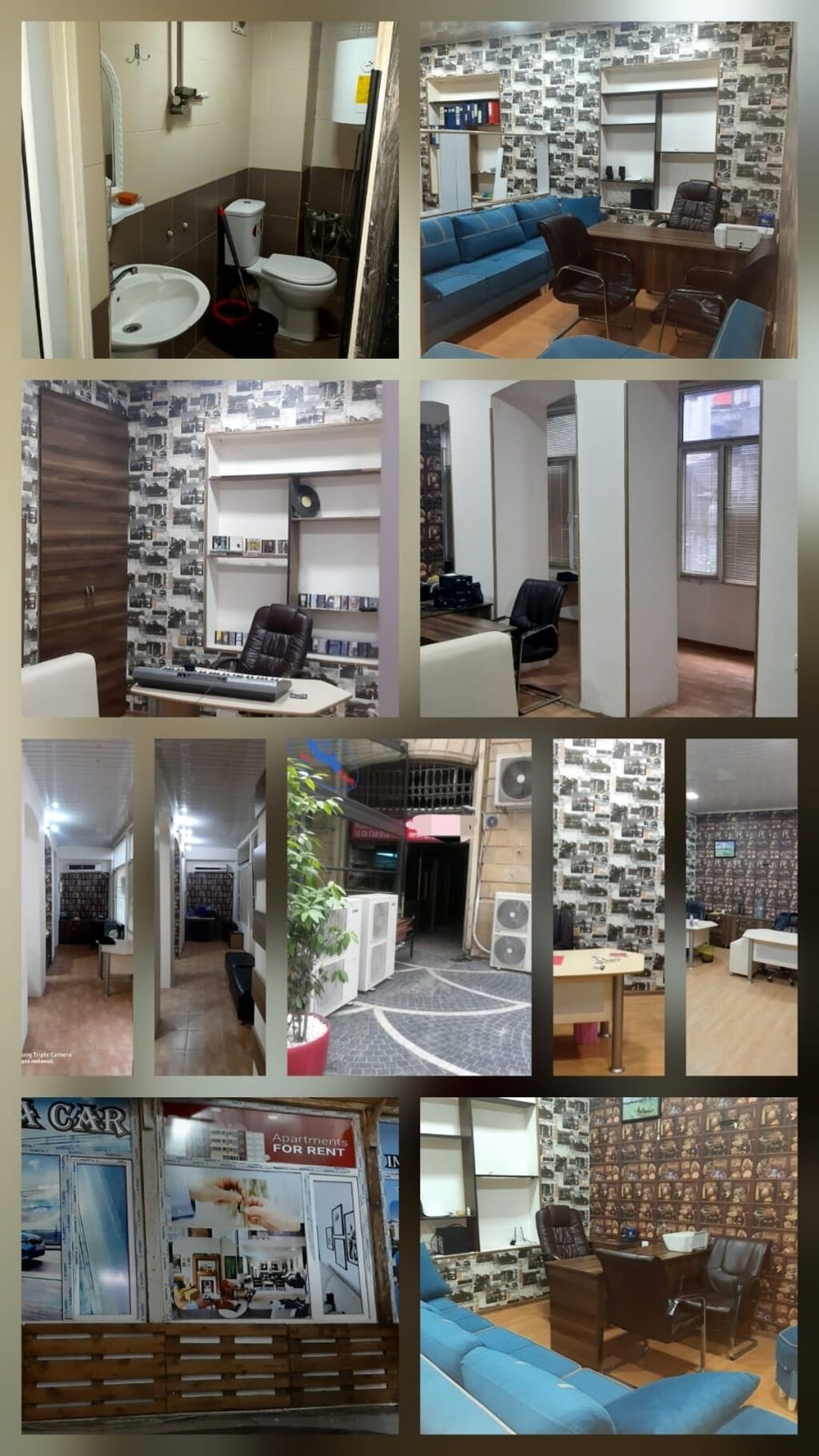 İcarəyə/ofis üçün tam təchiz olunmuş iş məkanı Xüsusiyyətlər: - Bir neçə ayrıca kabinet və açıq iş zonaları - Resepsiyon və gözləmə yeri, divan və kreslolar - İş masaları, rafiq-dolap sistemləri, arxiv üçün rəflər - Kondisioner sistemi və pəncərələrdən təbii işıq - Sürətli internet üçün infrastrukturlu işçi masaları (rozetkalar, kabel kanalları görünür) - Mətbəx/çay guşəsi üçün masa və elektrik çaydanı yeri - Sanitar qovşağı: unitaz, əl-üz yuyan, su qızdırıcısı (qazan) - Daxili işıqlandırma: spot işıqlar, tavan dekoru - Geniş dəhlizlər, rahat giriş-çıxış - Küçə vitrinində “Apartments for Rent” və ofis xidmətlərini təqdim edən vitrin-baner - Musiqi avadanlığı üçün masa (klaviatura üçün yer), ...