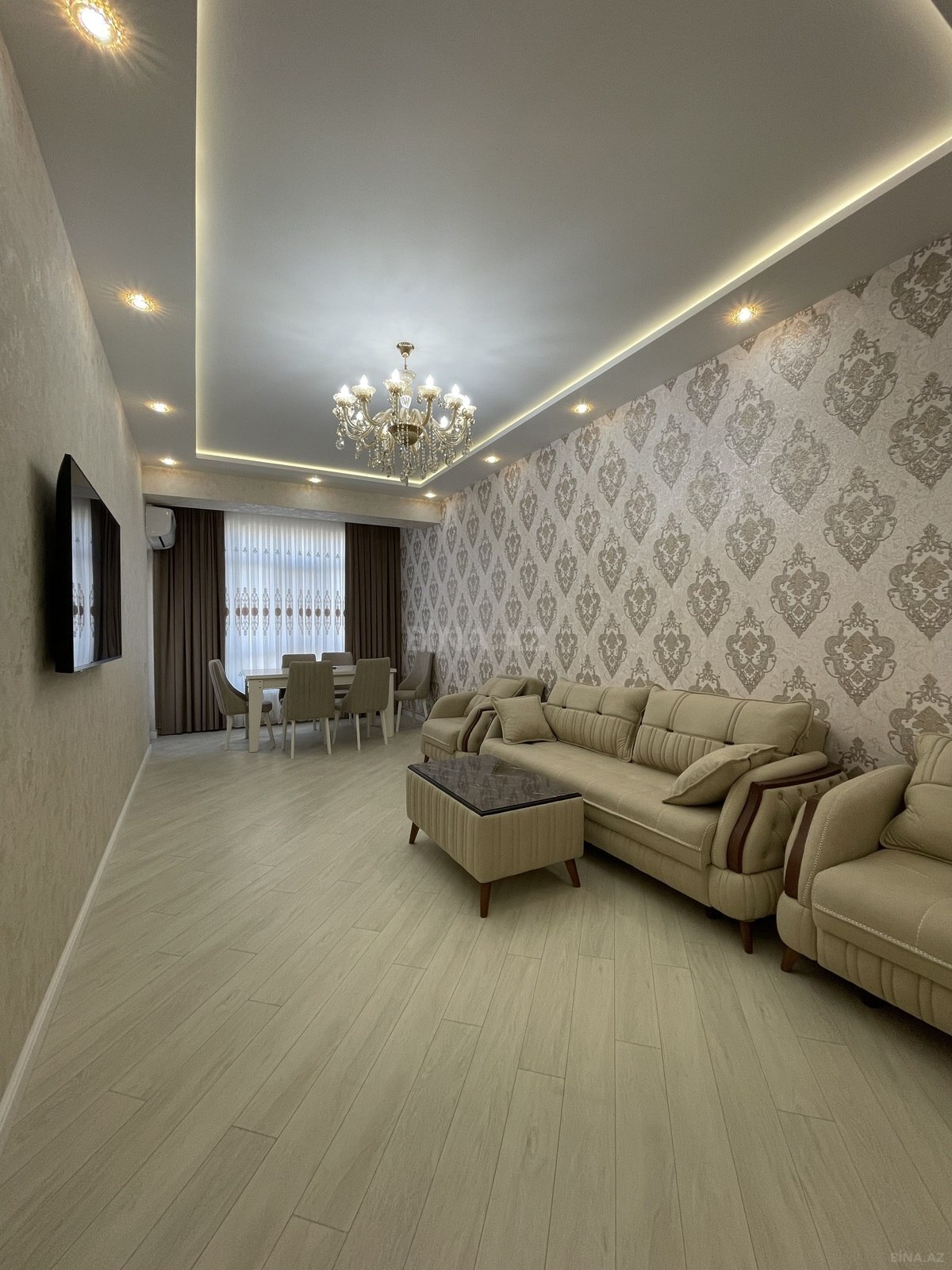 Üçüncü mikrorayon dairəsində yerləşən 17 mərtəbəli yeni tikilinin 13-cü mərtəbəsində yerləşən, ümumi sahəsi 148 kvadrat metr olan bu 4 otaqlı mənzil həm genişliyi, həm də keyfiyyətli təmiri ilə seçilir. Mənzilə daxil olanda ilk hiss olunan şey səliqəli dizayn, işıqlı məkanlar və rahat planlaşdırmadır.