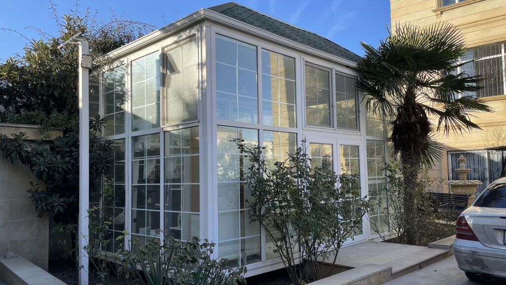 Satılır: şüşəbənd/qış bağı konstruksiyası - Tip: şüşə pavilyon/qış bağı - Karkas: Ağ rəngli dəmir/profil sistem - Şüşə: Bütöv panorama şüşələmə, xətli dekorativ şproslar - Qapı-pəncərə: açılan bölmələr (havalandırma üçün) - Ölçülər: Hündür tavanlı, iki səviyyəli genişlik (şəkillərdə görünən real ölçülər) - Dam: Metal/profilli örtük - Döşəmə: Karkas üzərində taxta platforma - Özəlliklər: - Həyətdə sərbəst dayanan, işıqlı və geniş məkan - Bitkilər üçün ideal mikroiqlim, istirahət/zona və ya kabinet kimi istifadə oluna bilər - Perimetr boyu böyük şüşə panellər sayəsində maksimum gün işığı - Estetik ağ çərçivələr, landşaftla uyğun minimalist dizayn - Aşağı hissə: dayaqlar üzərində qal ...