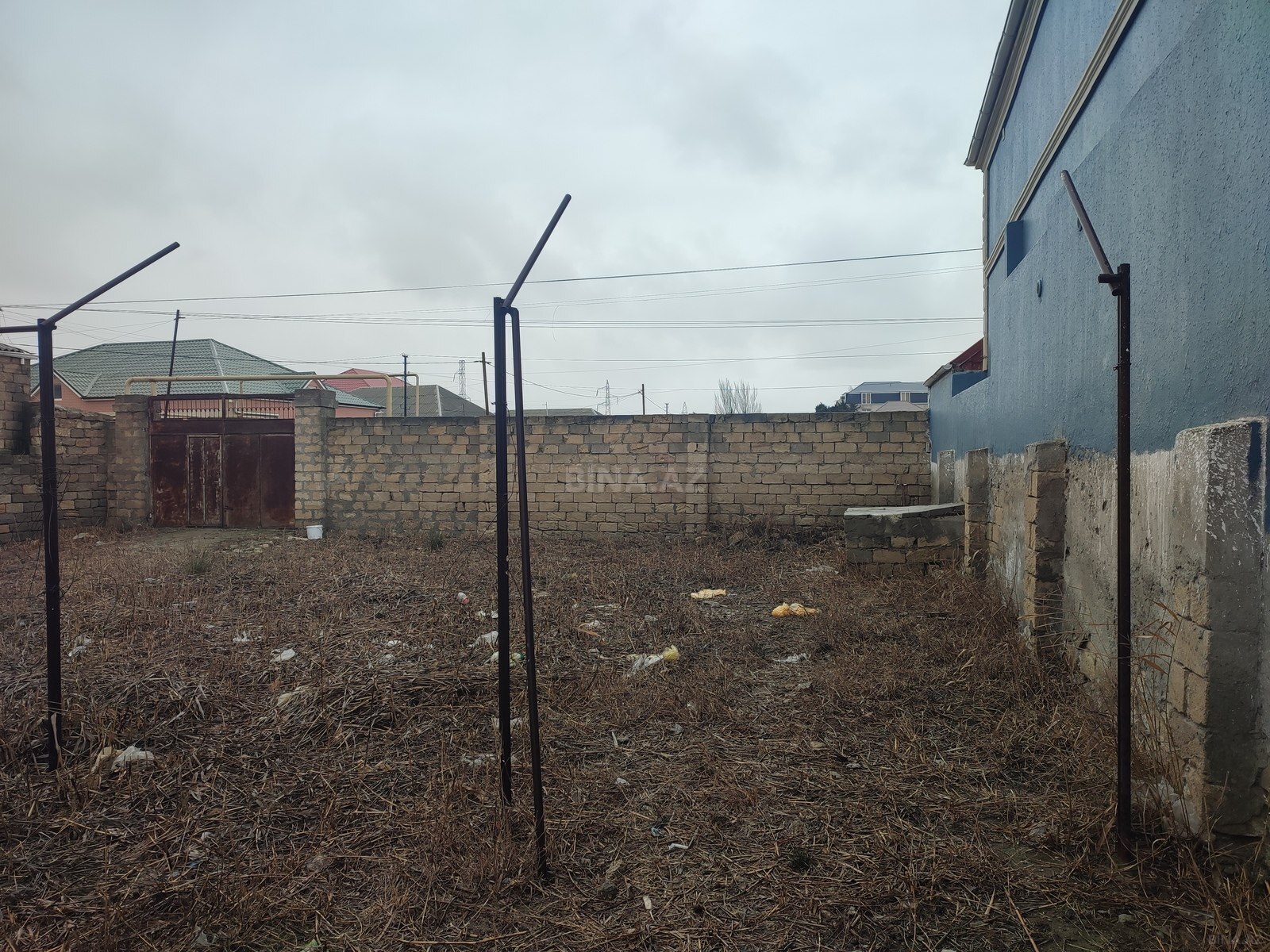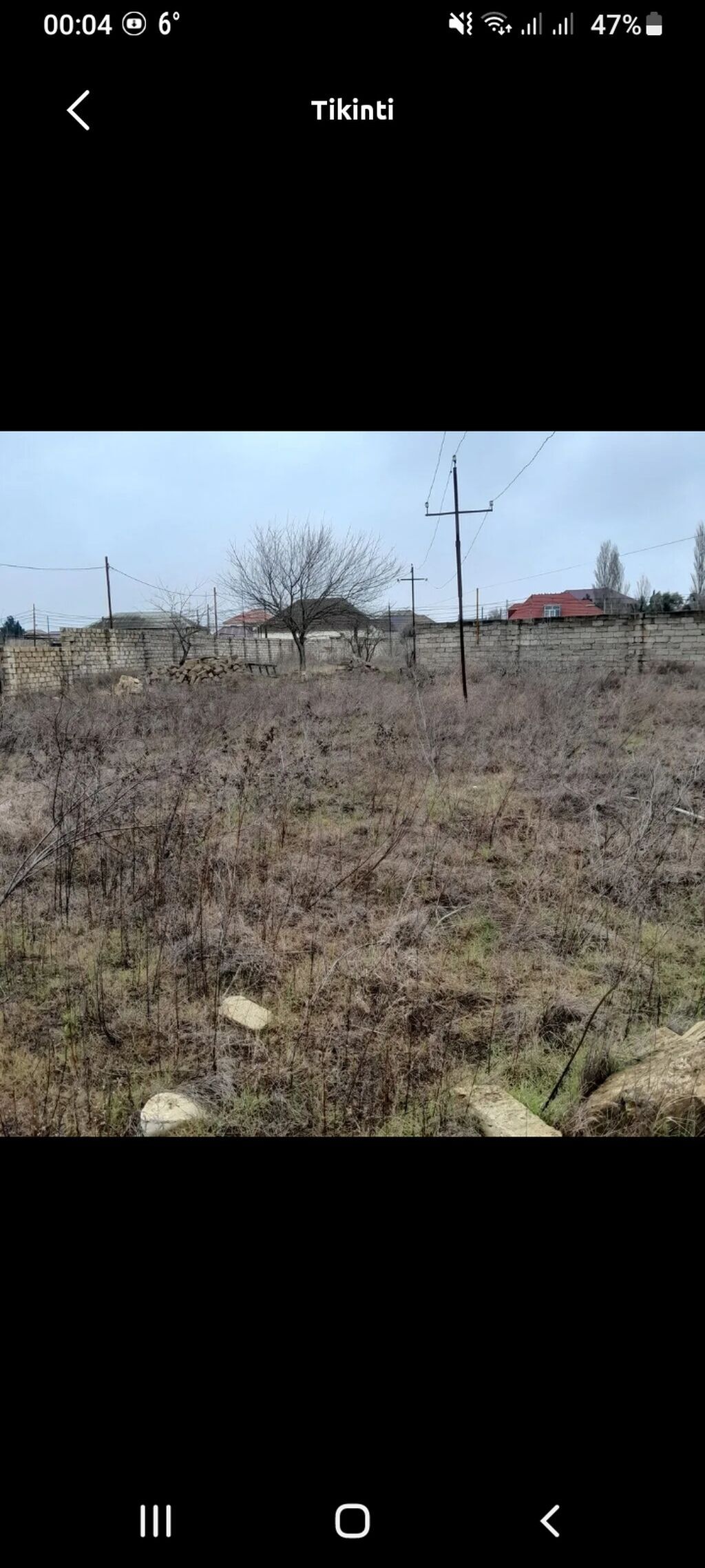 Torpaq sahəsi – tikinti üçün - Kateqoriya: Tikinti/torpaq - Təyinat: Fərdi yaşayış evi və ya yardımçı tikililər üçün əlverişli - İnfrastruktur: Sahənin kənarından elektrik xətti keçir; yaxınlıqda yaşayış evləri mövcuddur - Relyef: Düzən, hasarlı məhəllə daxilində - Bitki örtüyü: Təbii otlaq və kollar, planlaşdırma və abadlıq üçün uyğun - Yaxınlıq: Qonşuluqda tikili evlər, məhəllədaxili yollar, elektrik dirəkləri Qeyd: Şəkillərdə sahənin ümumi görünüşü və ətraf infrastruktur əks olunub.