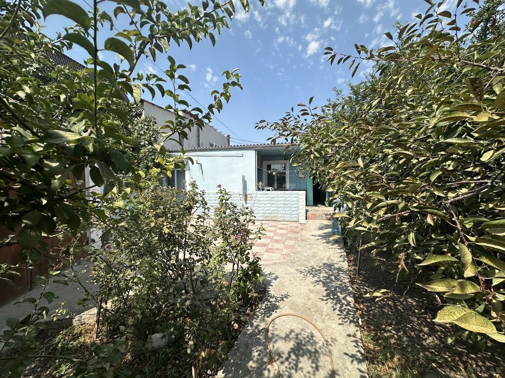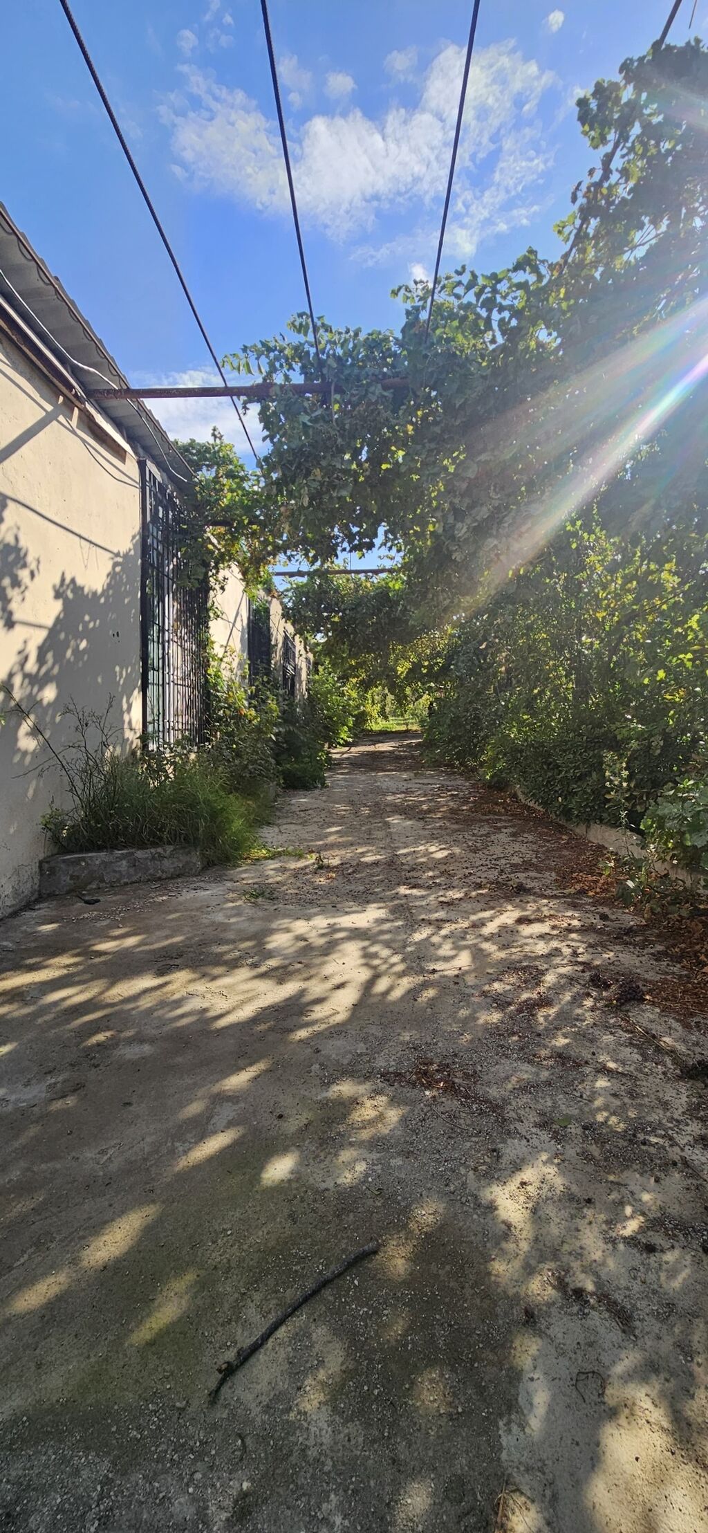 Yaşıl bağ sahəsi və üzüm çardağı ilə geniş həyət - Betonu çəkilmiş, avtomobil girişi üçün rahat yol. - Üst hissədə metal konstruksiya ilə qurulmuş üzüm çardağı – yayda kölgəlik və istirahət üçün ideal. - Yolun hər iki tərəfində sıx yaşıllıq, meyvə ağacları və dekorativ kollar. - Yan hissədə hasarlanmış tikili və pəncərə barmaqlıqları görünür. - Həyətin kənarı boyunca bəzək bordürü ilə ayrılmış yaşıllıq zolağı. Şəxsi bağ-baxça, ailəvi istirahət məkanı və ya fərdi təsərrüfat üçün əlverişli landşaft. Genişlik avtomobil saxlanışı və rahat manevr üçün imkan yaradır. Üzüm tirlərinin möhkəm metal karkası əlavə çardaq və ya asma işıqlandırma üçün uyğundur.