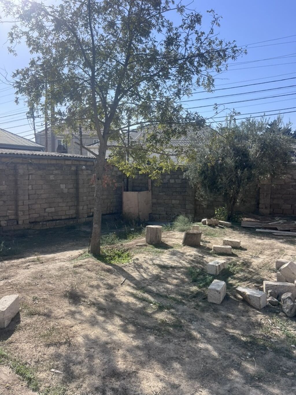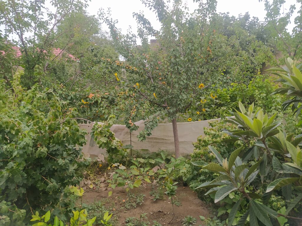 Məhsul: Torpaq sahəsi və meyvə bağı Təsvir: - Həyətyanı bağ sahəsi, daş hasarla əhatələnmiş. - Sahədə müxtəlif meyvə ağacları: ərik, tut, əncir, nar, üzüm kolları və zeytun ağacı görünür. - Günəbaxan sahəsi və müxtəlif dekorativ/kol bitkiləri əkilib. - Damcılama/suvarma xəttləri çəkilib, hortumlar mövcuddur. - Həyətdə iri həcmli plastik su çəni (üst qapaqlı) quraşdırılıb. - Köməkçi tikili divarları (daşdan) və təsərrüfat üçün açıq meydança. - Taxta çəpərlə ayrılmış gəzinti yolu, çınqıllı keçid. - Bağ işləri və tərəvəz əkini üçün yararlı geniş əkini sahələri. Bu sahə şəxsi təsərrüfat, meyvə-tərəvəz yetişdirmə və sakit istirahət üçün münasibdir.