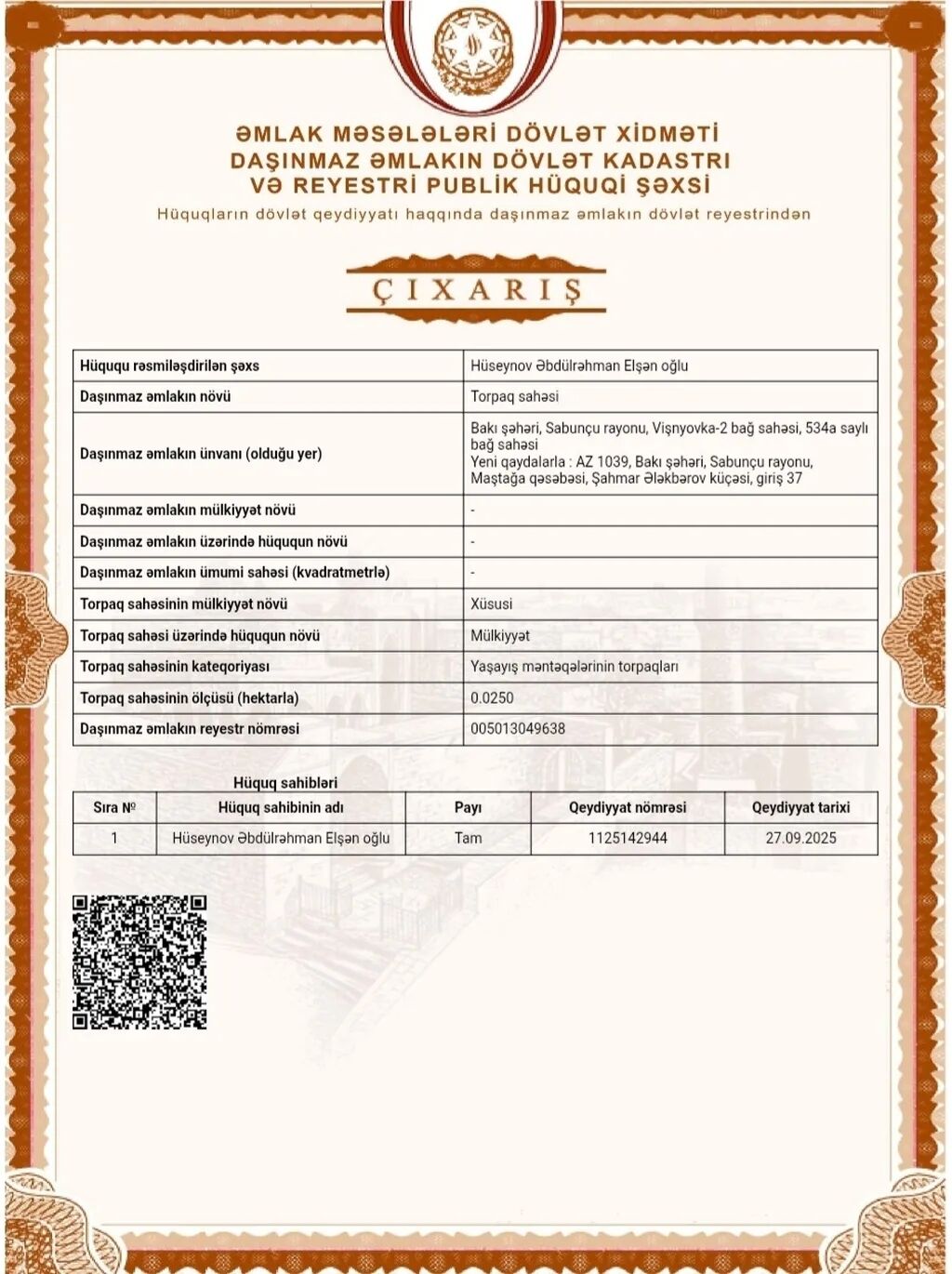 Novxanı bağlarında hündür ərazidə 5 sot çıxarışlı torpaq sahəsi satılır. Torpaq sahəsi yaşayış üçün əlverişli, sakit və perspektivli ərazidə yerləşir. Kommunal xətlər (işıq, qaz, su) ərazinin yaxınlığından keçir. Yolu rahatdır, ətrafda yaşayış evləri mövcuddur.Ana qumu öz qumudur 1 sotu – 8 500 manat Çıxarış (kupça) var
